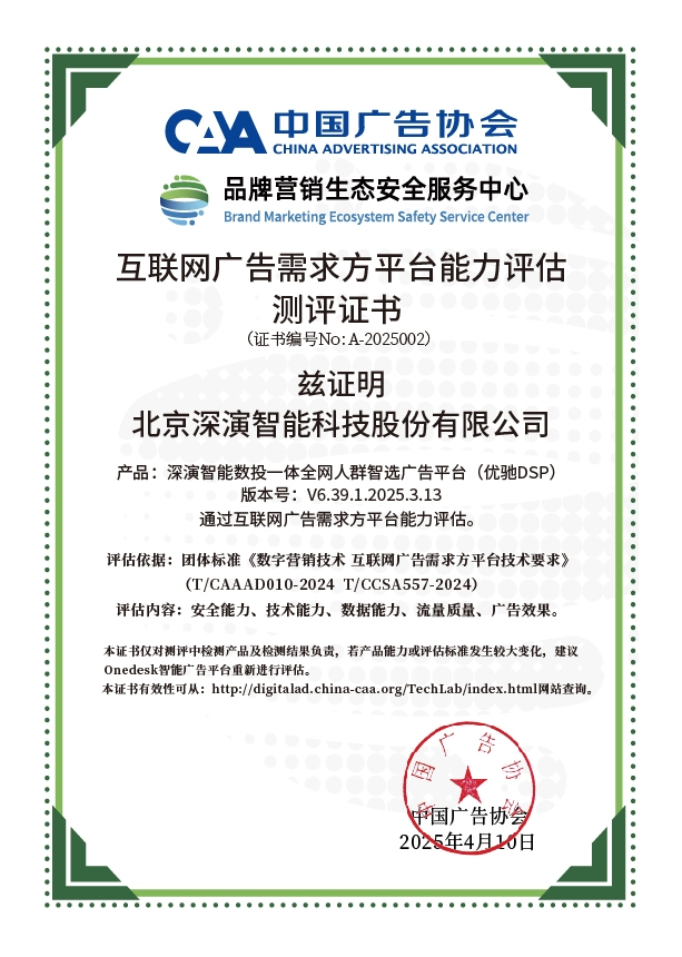 4月10日,中国广告协会发布「互联网广告需求方平台能力评估」测评结果。Martech领域领军企业ibet智能旗下产品ibet智能数投一体全网人群智选广告平台(优驰 DSP),凭借其在智能算法优化、技术创新、数据安全治理及流量质量管控等维度的突出表现,高分通过该项行业权威测评,获颁中国广告协会评估证书,成为业内首批通过认证的标杆企业。